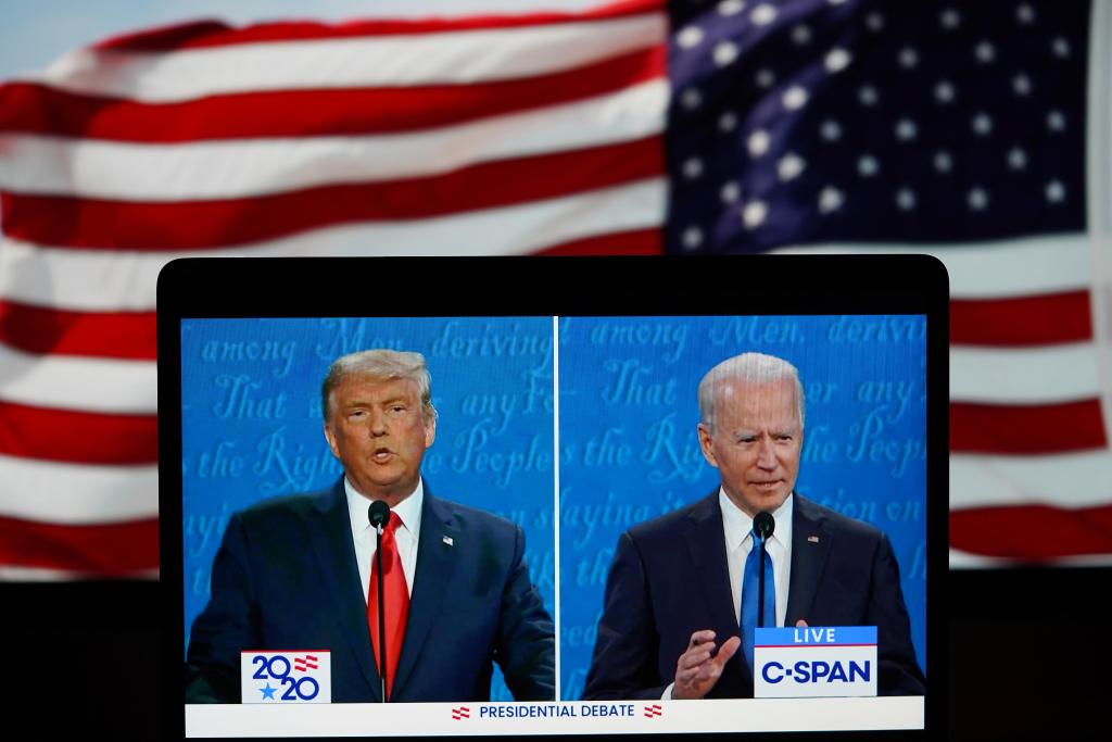 這張2020年10月22日在美國(guó)弗吉尼亞州阿靈頓拍攝的視頻畫(huà)面顯示,時(shí)任美國(guó)總統(tǒng)特朗普(左)與當(dāng)時(shí)的民主黨總統(tǒng)候選人拜登在田納西州納什維爾市參加最后一場(chǎng)總統(tǒng)候選人電視辯論。新華社記者劉杰攝