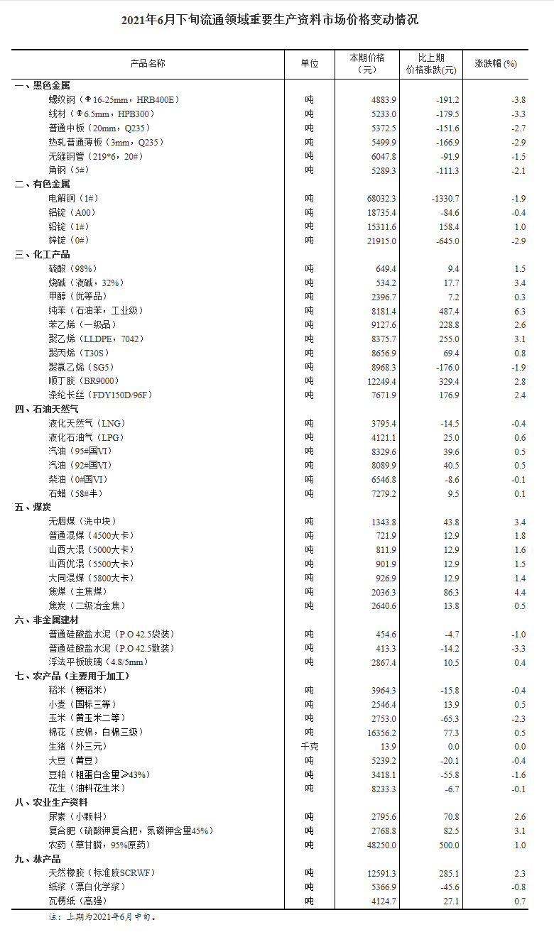 人民網北京7月5日電 (申佳平)據國家統(tǒng)計局官網消息,據對全國流通領域9大類50種重要生產資料市場價格的監(jiān)測顯示,2021年6月下旬與6月中旬相比,29種產品價格上漲,20種下降,1種持平。