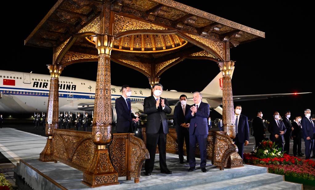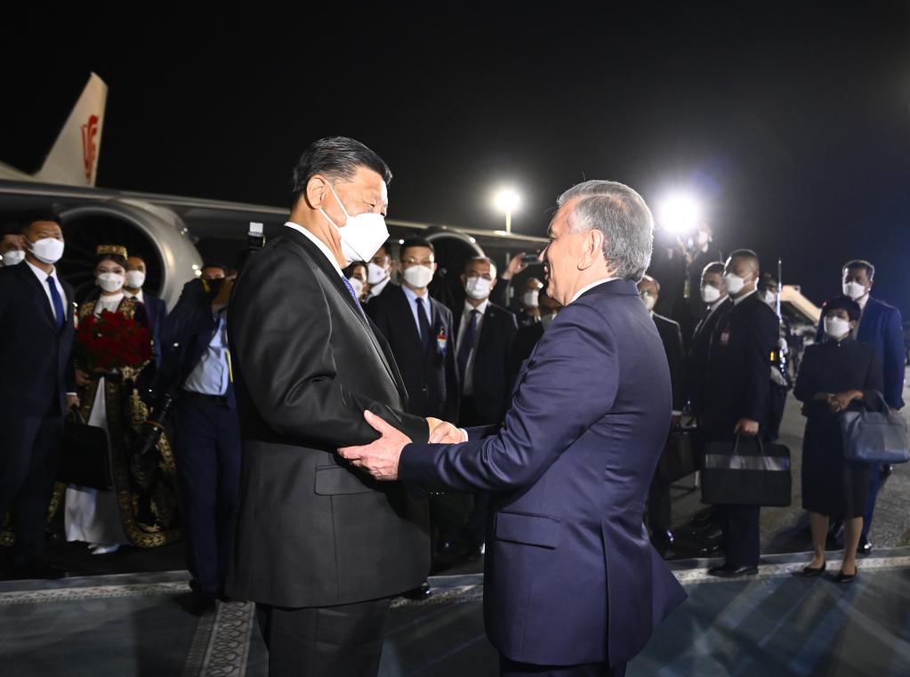 當(dāng)?shù)貢r間9月14日晚,國家主席習(xí)近平乘專機(jī)抵達(dá)撒馬爾罕,開始對烏茲別克斯坦共和國進(jìn)行國事訪問并出席上海合作組織成員國元首理事會第二十二次會議。這是烏茲別克斯坦總統(tǒng)米爾濟(jì)約耶夫、政府總理阿里波夫、外長諾羅夫、撒馬爾罕州州長圖爾濟(jì)莫夫等高級官員在機(jī)場熱情迎接。新華社記者 李學(xué)仁 攝