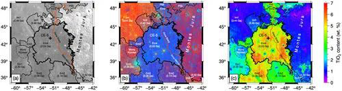 (a)嫦娥五號(hào)著陸區(qū)光學(xué)影像。(b)嫦娥五號(hào)著陸區(qū)假彩色波段合成影像。(c)嫦娥五號(hào)著陸區(qū)鈦含量分布圖。(中科院國(guó)家空間科學(xué)中心供圖)