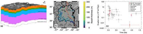 (a)嫦娥五號(hào)著陸區(qū)各下伏玄武巖單元的厚度。(b)Em4與Em3單元厚度之和的空間分布。(c)嫦娥五號(hào)著陸區(qū)以及月表其他地區(qū)玄武巖巖漿的噴發(fā)率。(中科院國(guó)家空間科學(xué)中心供圖)