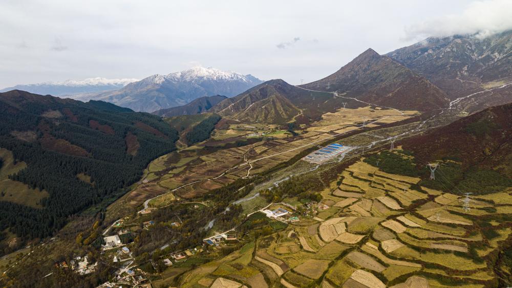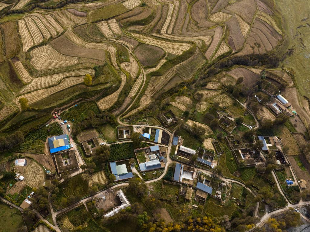 這是10月8日拍攝的貴德縣尕讓鄉(xiāng)關加村一角(無人機照片)。新華社記者 張龍 攝
