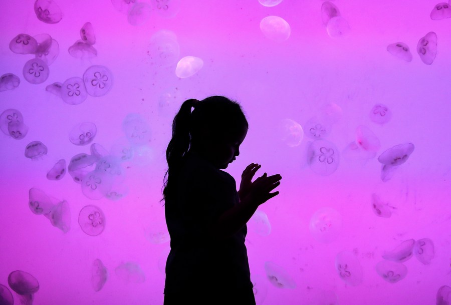10月5日,小朋友在遼寧省沈陽(yáng)海洋探索中心游覽。新華社記者 龍雷 攝