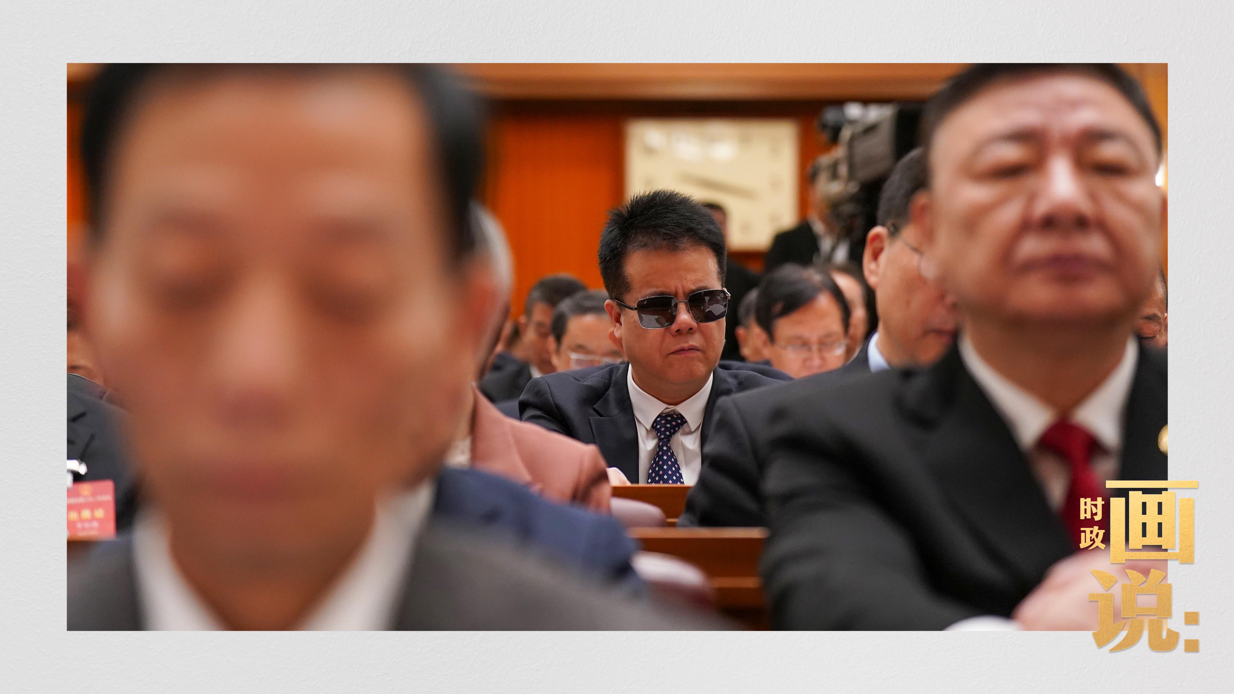 △指尖聽會。視障人士、全國人大代表王永澄撫摸著特制的盲文版報告。