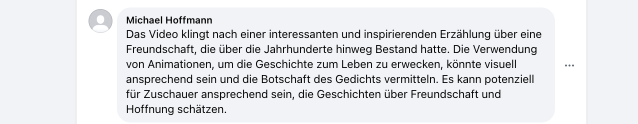 德語(yǔ)網(wǎng)友留言:“這段視頻講述的是一段歷久彌新的友誼,聽(tīng)起來(lái)既有趣又鼓舞人心。使用動(dòng)畫(huà)將故事栩栩如生地展現(xiàn)出來(lái),既具有視覺(jué)吸引力,又能傳達(dá)詩(shī)歌的信息”。