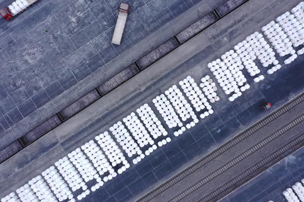 在察爾汗車站的貨場上,數(shù)十輛叉車往來穿梭,將堆積的鉀肥送進(jìn)車廂。鐵軌上滿載著鉀肥的專列將從這里出發(fā),通往全國各地。