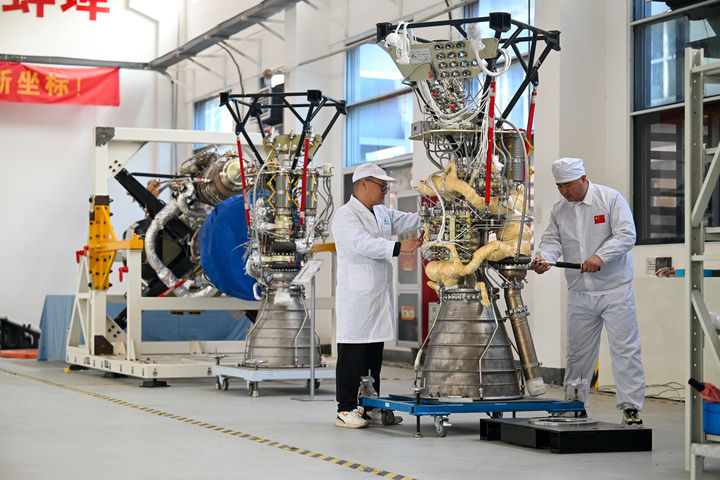 2024年3月11日,在安徽九州云箭航天技術(shù)有限公司生產(chǎn)基地,技術(shù)人員對(duì)即將交付的液體火箭發(fā)動(dòng)機(jī)進(jìn)行最后的檢查。新華社發(fā)(黃洋洋攝)
