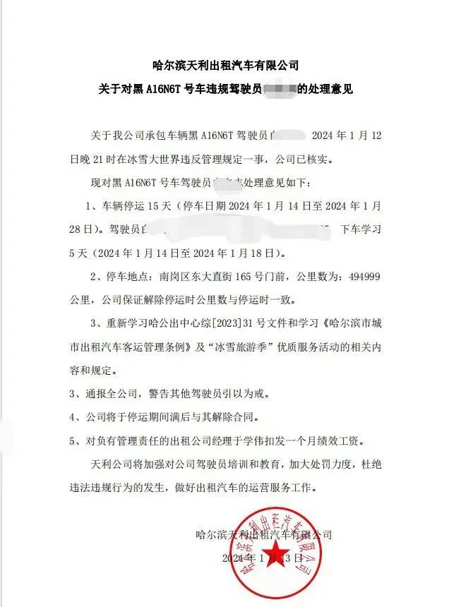 天利公司做出的處罰為,車輛停運15天(停車日期2024年1月14日至28日),駕駛員下車學習;通報全公司,警告其他駕駛員引以為戒;公司將于停運期間滿后與其解除合同;對負有管理責任的出租公司經理扣發(fā)一個月績效工資等。