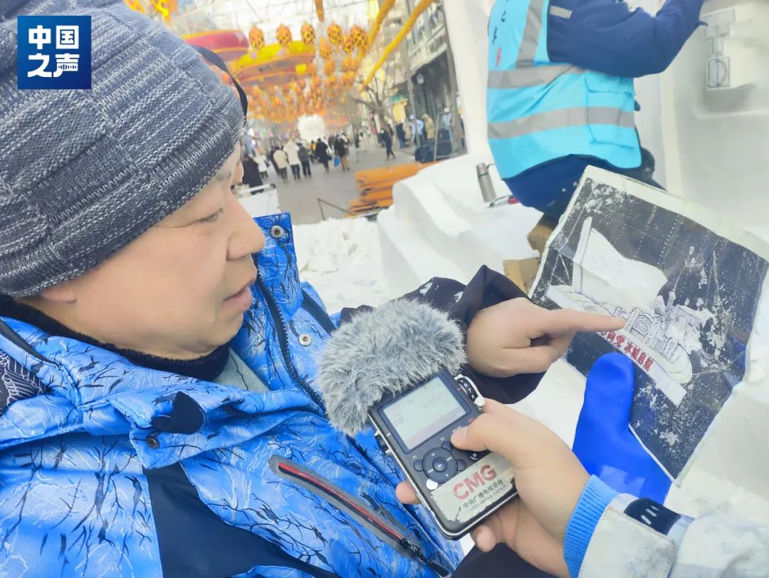 △臧師傅向記者介紹在哈爾濱中央大街的制作的另一個(gè)雪雕作品