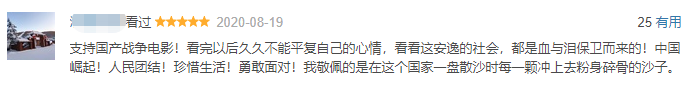 《八佰》成為爆款,一個(gè)重要的原因是它抓住了中國(guó)人的家國(guó)情懷和抗?fàn)幰庾R(shí),凝聚了中國(guó)軍民齊心抵抗外辱的共同情緒。正因?yàn)橛袩o(wú)數(shù)八佰壯士一樣的英雄,中華民族才得以最終贏得抗戰(zhàn)勝利。觀眾為80年前以命護(hù)國(guó)的平民英雄落淚,實(shí)質(zhì)是發(fā)自肺腑地敬仰抗戰(zhàn)英雄。